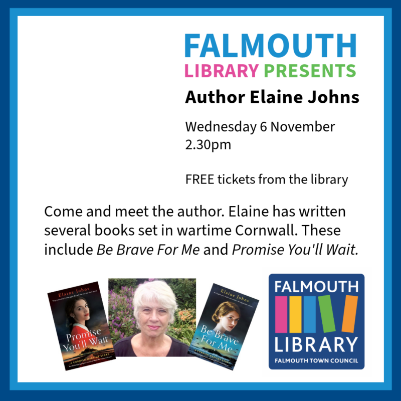 Come and meet author Elaine Johns at Falmouth Library. Elaine has written several books set in Wartime Cornwall. These include Be Brave For Me and Promise You'll Wait.