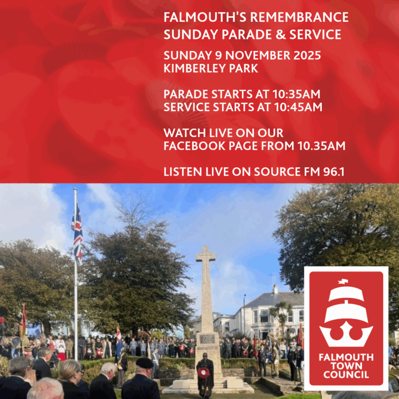 Falmouth's Remembrance Sunday Parade and Service will take place on Sunday 9 November at Kimberley Park.