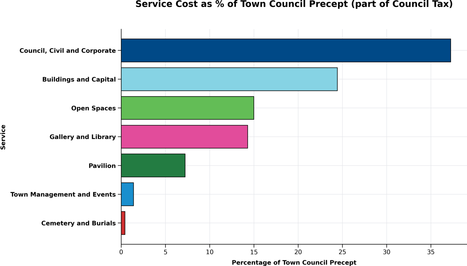 The chart below shows how the town council precept is distributed across the main services provided by the council.